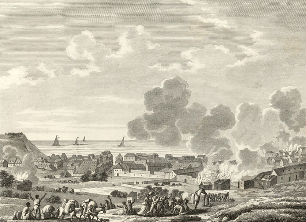 In 1793, when the capital of the colony, Cap-Français, was set ablaze by Black revolutionaries, paintings depicting the fires told tales of property destruction designed to produce more sympathy for the lost buildings than for the human beings who had been tortured and enslaved within them. Two of the most famous examples, by J.L. Boquet and Swebach-Desfontaines, used the specter of Black vengeance to paint the colony’s nearly forty thousand French residents as innocent victims who had lost all their worldly possessions as they fled the smoke and ashes en masse.
