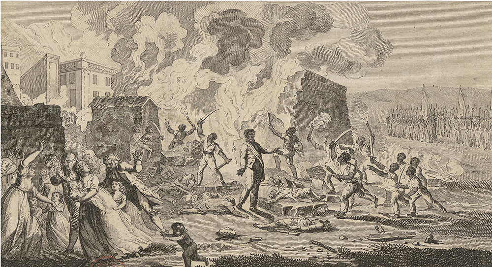 Immediately after the beginning of the Haitian Revolution in August 1791, newspapers around the world printed tales of the widespread deaths of whites. “The news from Saint-Domingue is horrifying,” reported the Paris-based Le Courrier extraordinaire on October 30. “Two hundred plantations on fire; three hundred whites massacred.” Historical narratives tended to characterize the revolution in much the same way. In the two-volume Saint-Domingue, ou Histoire de ses Révolutions, anonymously published around 1804, the year the revolution ended, a frontispiece reduced the rebellion of enslaved people to a simple race war: “General revolt of the negroes. Massacre of the whites.”